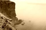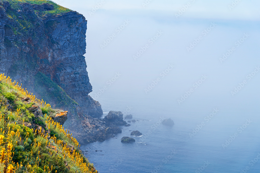 Rocky seashore and fog over the water. Cape Kaliakra, Bulgaria. Rocky coast of Cape with sea views.