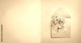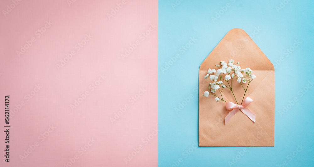 craft envelope with a bouquet of flowers with pink hearts on a blue background. Valentine's Day greeting concept