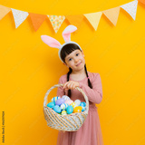 spring cheerful girl with rabbit ears on her head with basket colored eggs in her hands on a yellow background.