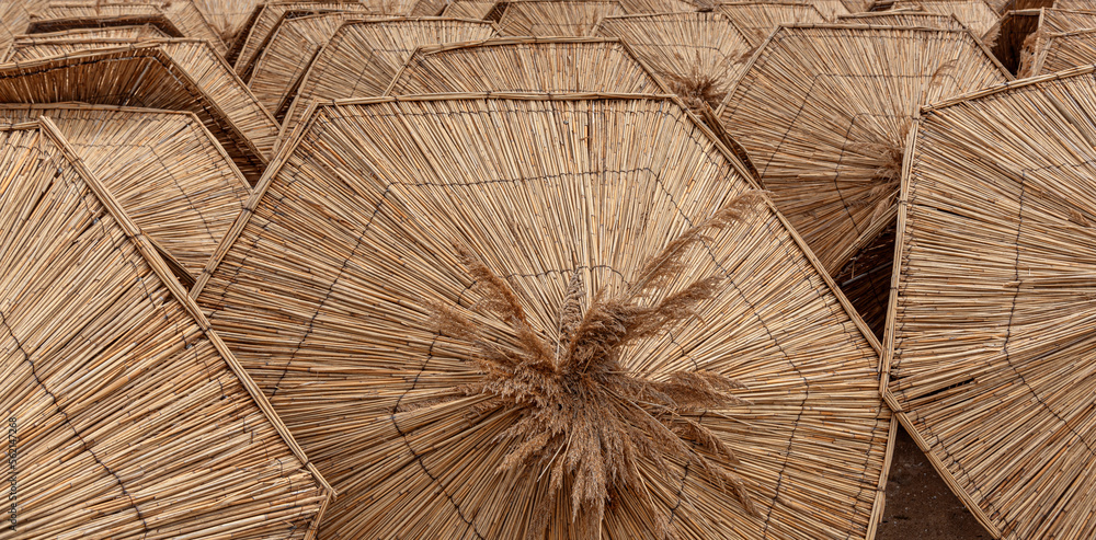 Straw beach umbrellas are stacked as an abstract background.