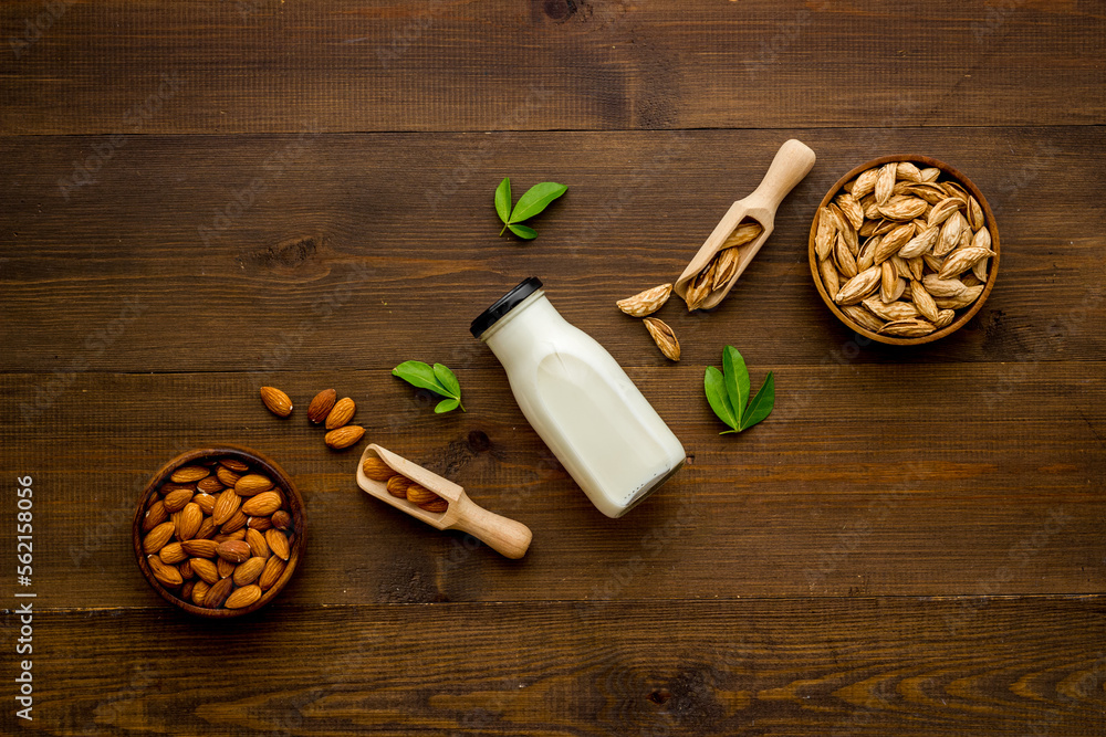 Organic almond milk with almond nuts. Non dairy vegan drink