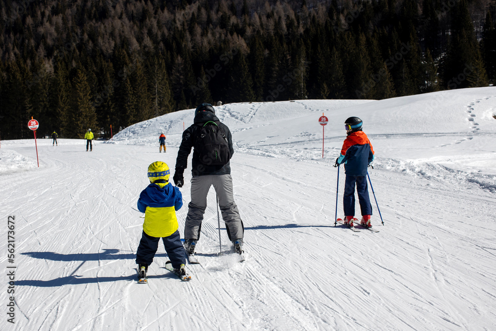 Happy family, skiing in Italy on a sunny day, kids and adults skiing together