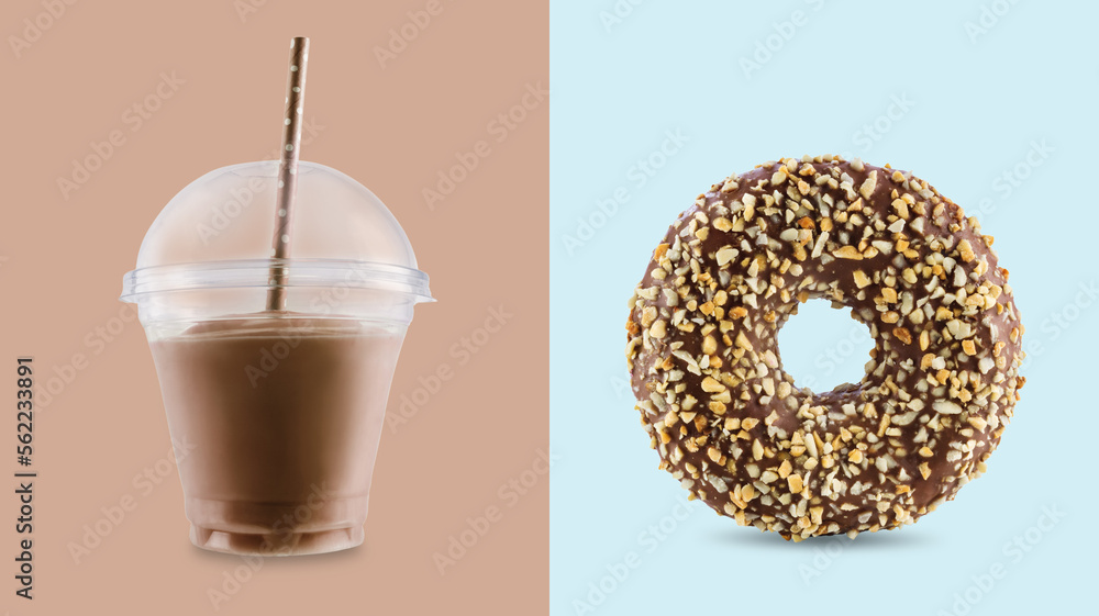 Fresh cold coffee drink in a plastic glass with chocolate donut on a blue brown background