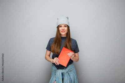 Smiling student girl in teenager clothes style with red book. Isolated woman portrait.