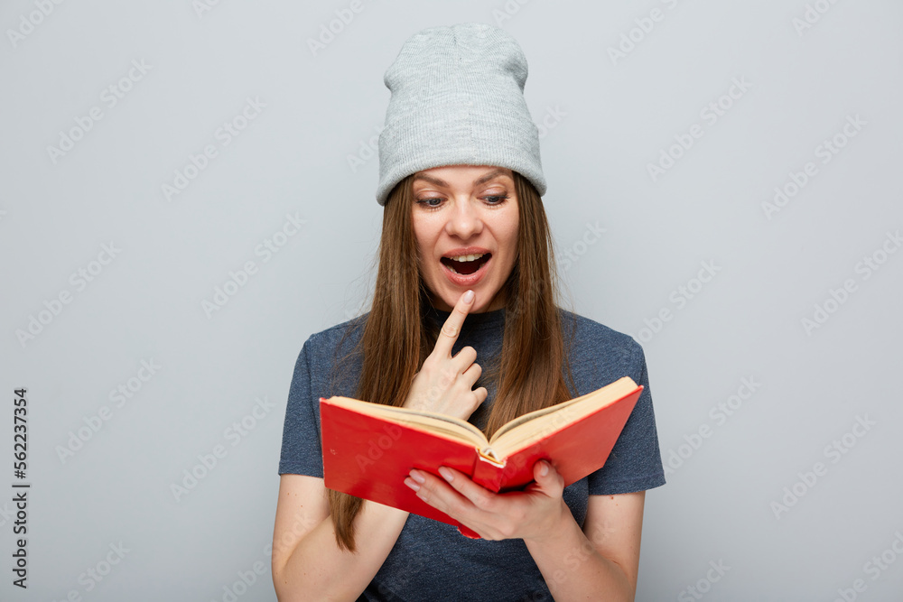 Close up portrait of excited student girl in teenager clothes holding open red book.