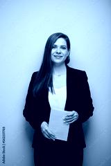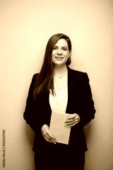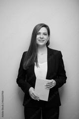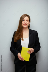 Smiling school teacher woman or adult student with book. Isolated business lady portrait with black suit.