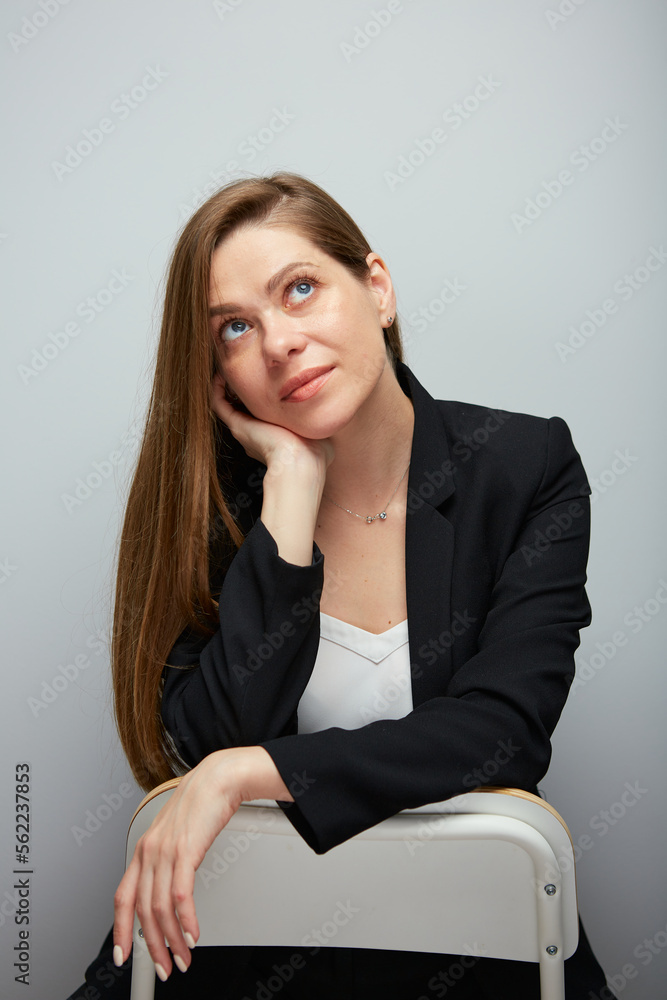 Dreaming business woman sitting on chair and looking up, close up portrait.