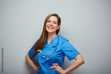 Smiling nurse in blue suit. Isolated portrait with copy space.