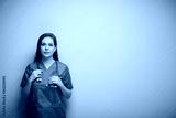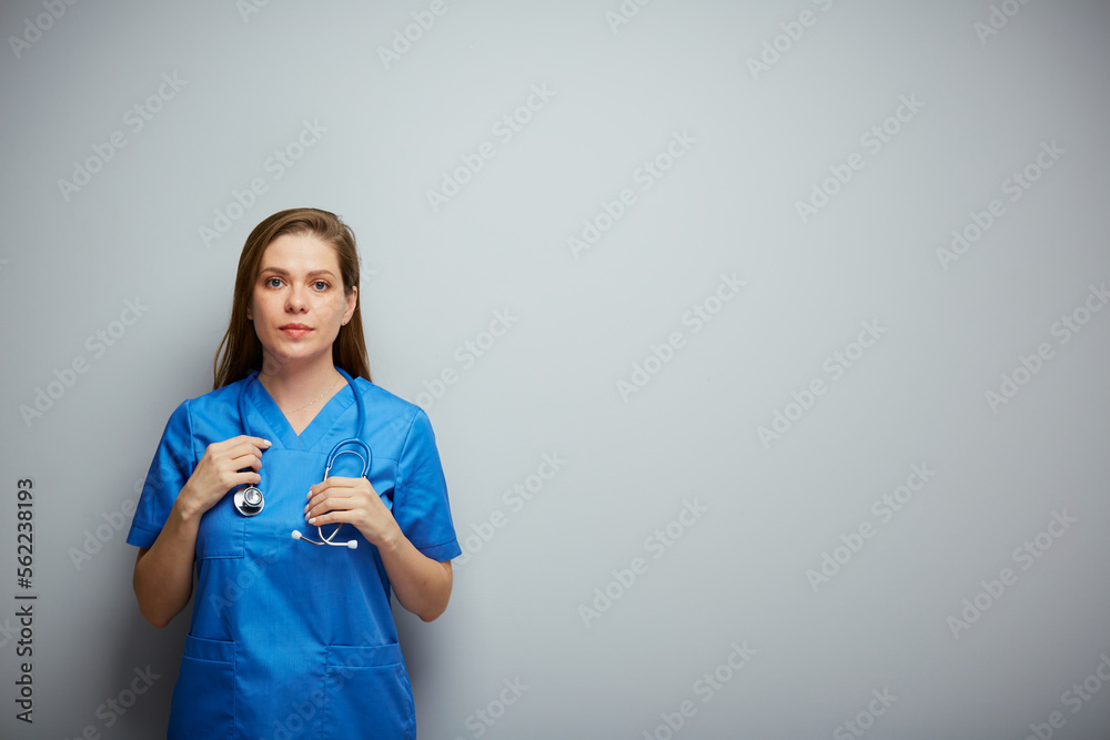 Serious doctor woman in medical suit. Isolated portrait with copy space.
