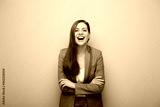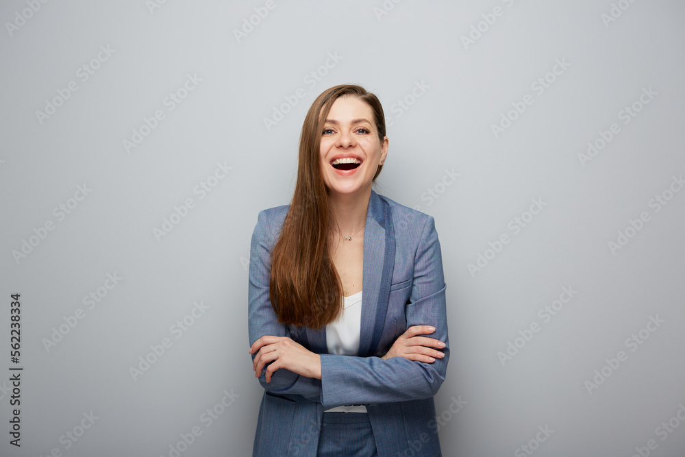 Excited woman in business suit smiling and happy. Female portrait.