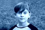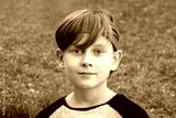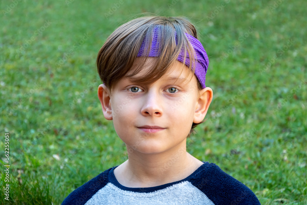 Street portrait of a 10-year-old boy with a bandana on his head against a background of greenery and grass.