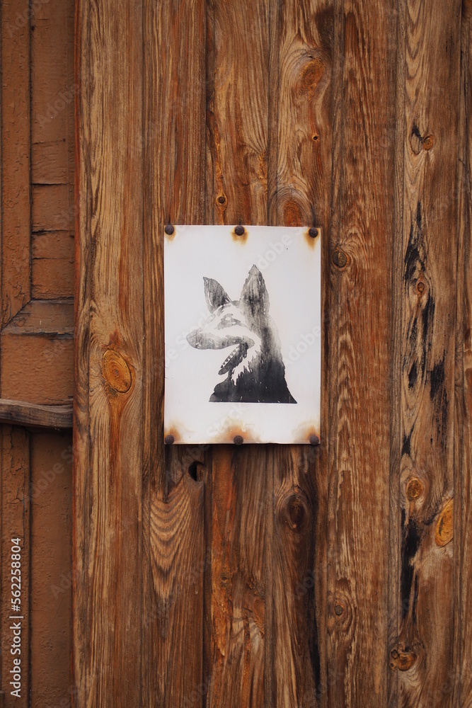 Metalowa tabliczka z rysunkiem psa na drewnianej bramie