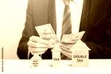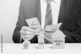 Wooden houses with words tax, business tax concept, us dollars money in hands