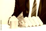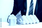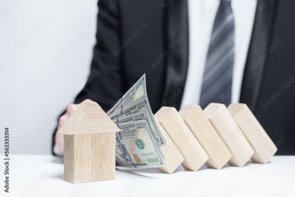 Wooden house under money protection, domino, insurance safety property concept