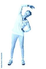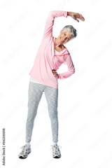 Senior woman, portrait or stretching on isolated white background in exercise, workout and training for body wellness. Smile, happy or retirement elderly in warm up for fitness pain relief on mock up