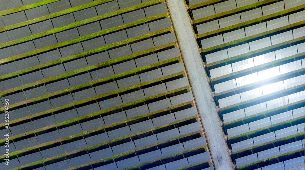 Aerial view of solar farm. Solar power for green energy. Sustainable resources. Solar cell panels use sun light as a source to generate electricity. Photovoltaics or PV. Sustainable renewable energy.