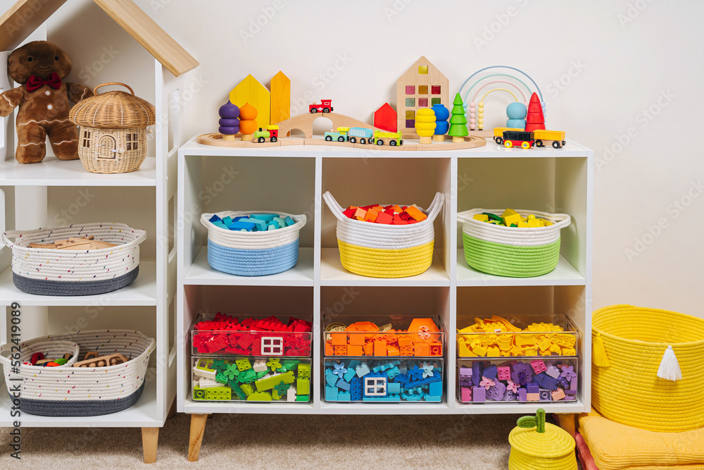 White shelving with colorful storage baskets and transparent boxes in children room. Rainbow toys in stylish baskets and plastic containers. Organizing and Storage Ideas in playroom. Interior design.