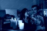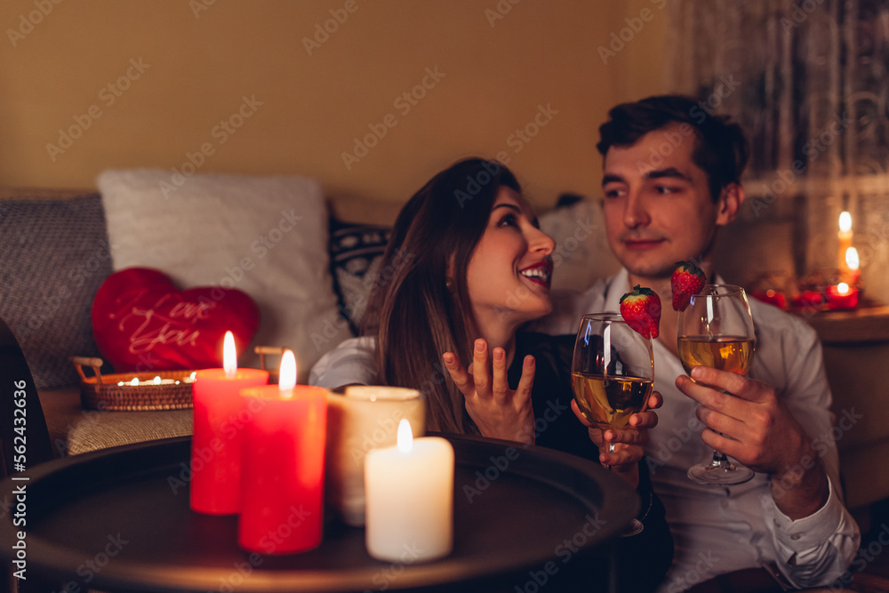 Valentines Day couple in love talking drinking wine with strawberries having romantic dinner celebrating at home