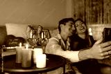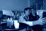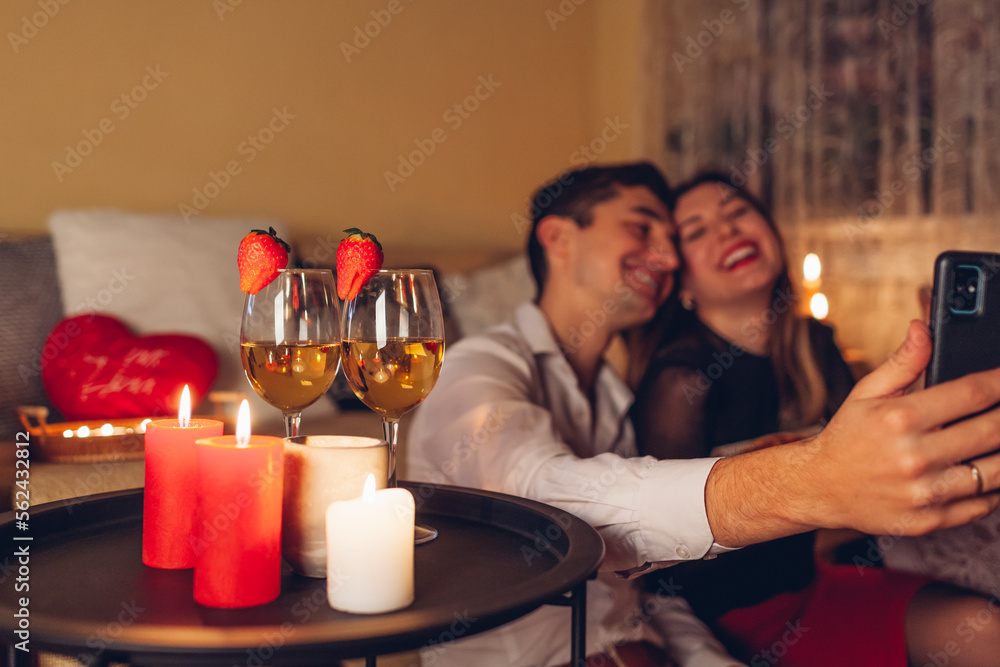 Valentines Day loving couple taking selfie on phone by wine glasses with strawberries having romantic dinner at home