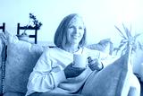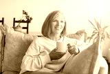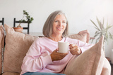 Portrait happy healthy middle aged woman sitting on comfortable couch at home
