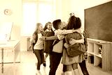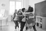 School friendship. Joyful elementary school students gather in circle and hug at school before classes. Friendly classmates with backpacks on their shoulders are having fun and greeting each other.