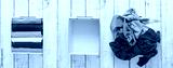mess and order, clean neatly folded and a pile of dirty clothes on a wooden background, organization and storage system