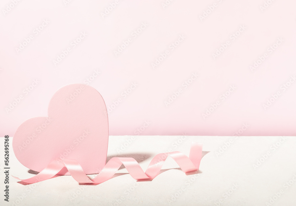 Delicate composition for Valentine's Day or Wedding Day. Pink heart on a pastel pink background, silk ribbon.