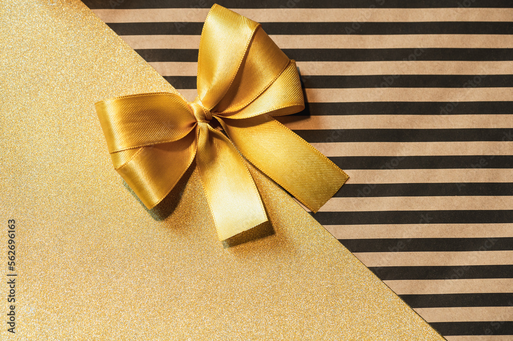 Yellow bow on golden and striped craft wrapping paper.Festive gift wrapping.