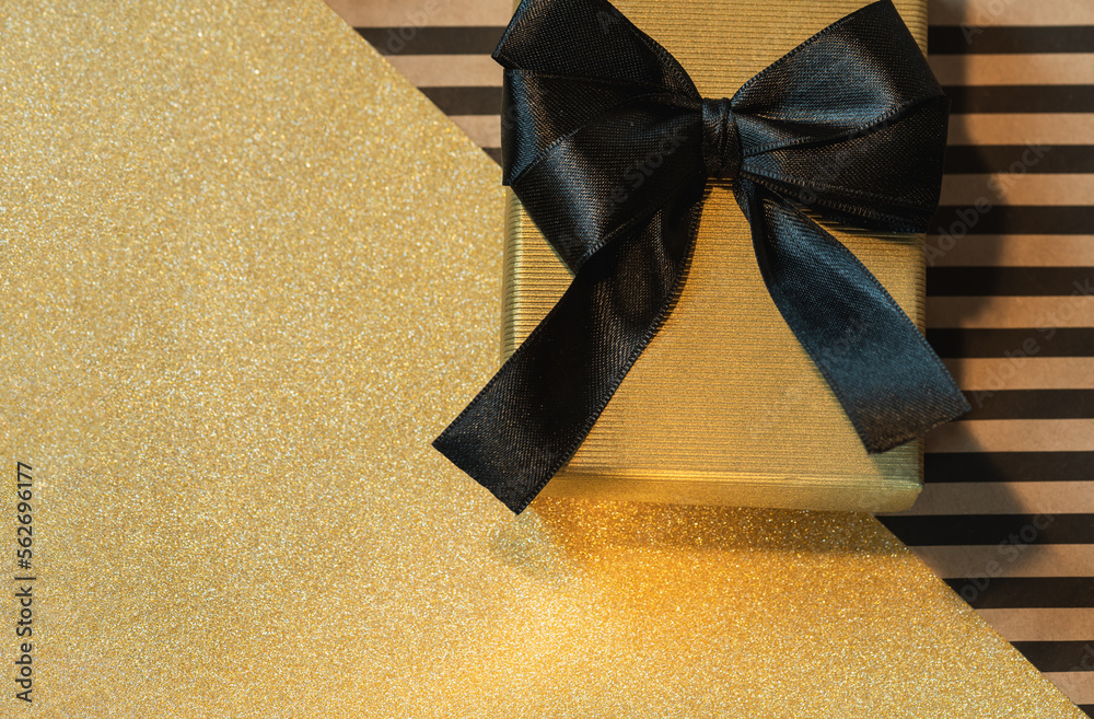 Gift box in golden color with a black bow on sparkling golden wrapping paper.