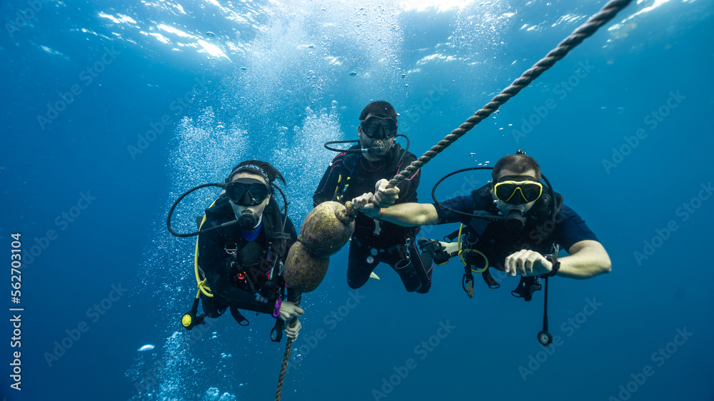 three professional diver checking his dive computer to ascend safely. holding on to a rope