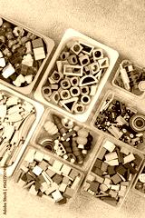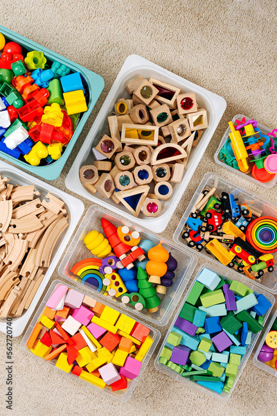 Toy Storage boxs in the children's room. Plastic containers with colorful wooden toys. Organizing and Storage Ideas in nursery. Clean up toys and reduce the clutter. Top view