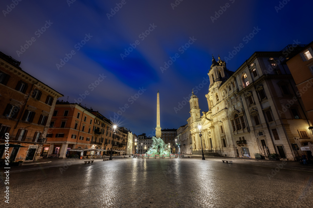 Scenic view with Egyptian obelisk and Sant Agnese Church at illuminated Piazza Navona before sunrise, Rome, Italy
