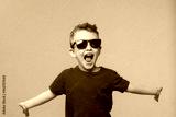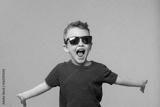 Portrait of surprised cute little toddler boy in sunglasses. Child with open mouth having fun isolated over orange background. Looking at camera. Wow funny face