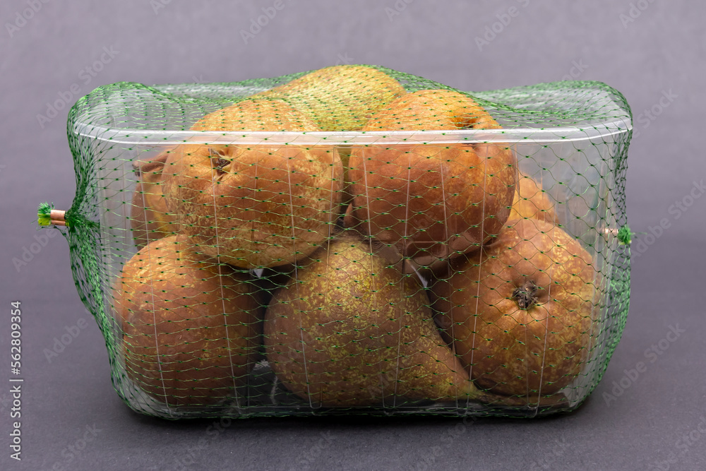 Pears lie in a transparent plastic box under a grid on a dark background, close-up, side view.