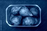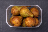 A bunch of pears are lying in a transparent plastic box on a dark background, close-up, top view.
