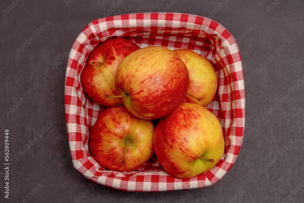Red and yellow apples are lying in a wooden basket on a dark background, close-up, top view.