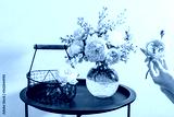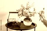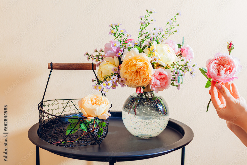 Close up of fresh english roses. Woman makes bouquet in transparent vase of orange yellow pink flowers on table at home.