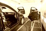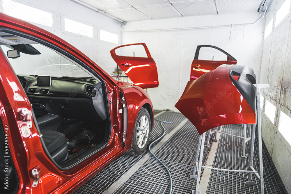 A luxury red car in a paint shop with its doors removed for a fresh coat of paint. High-quality photo