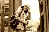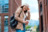 Young confident stylish millenial girl standing in city center and checking time on her hand watch
