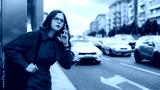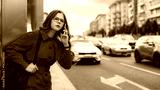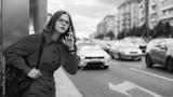 Smiling girl in glasse with backpack over shoulder speaking on mobile phone while standing on street