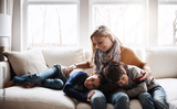 Happy family, mother bonding with children and relax on sofa for love, care and smile at home together. People, mom and kids lying on couch in the living room for cozy winter hug or fun with parent