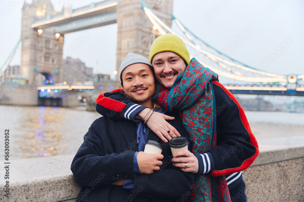Young Happy Asian And Caucasian Same Sex Interracial Tourists Couple Smiling At Camera Drinking Coffee On Vacation City Break London