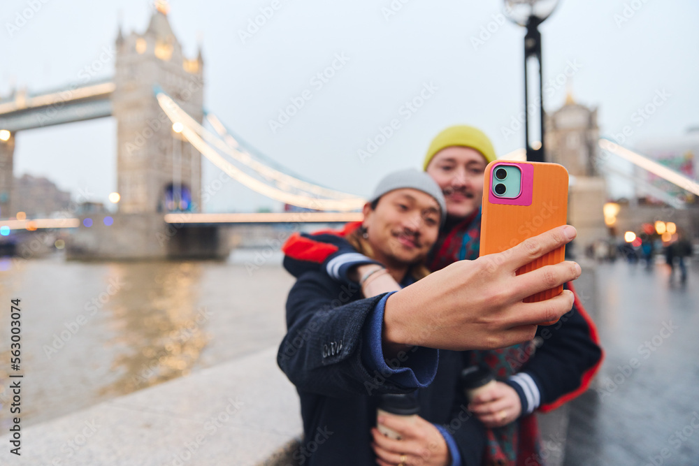Young Happy Asian And Caucasian Same Sex Interracial Tourists Couple Smiling Taking A Selfie On Vacation City Break London Focus On Smartphone
