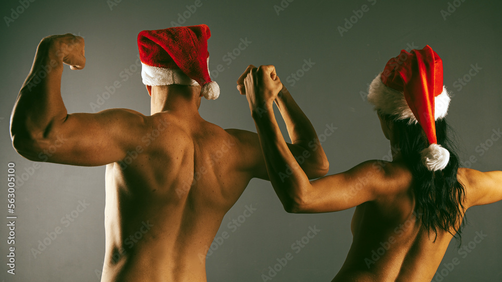Couple sexy. Man and woman posing studio. Couple love. Santa hats.