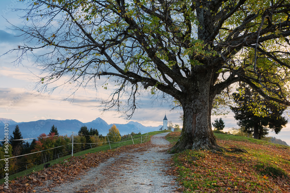 Picturesque autumn landscape with church and big tree in Slovenia