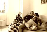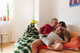 Loving Same Sex Male Couple At Home Sitting On Sofa Cuddling Watching TV Together Kissing