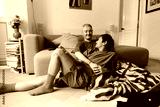 Young Happy Asian And Caucasian Same Sex Interracial Couple At Home Sitting Against Sofa Cuddling Watching TV Together Relaxing