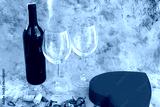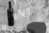 Valentine's Day (February 14 or fourteen) ingredients on blue background: Red wine bottle, two wine glass, red heart shaped box gift and dry rose leaves. Side or profile view.