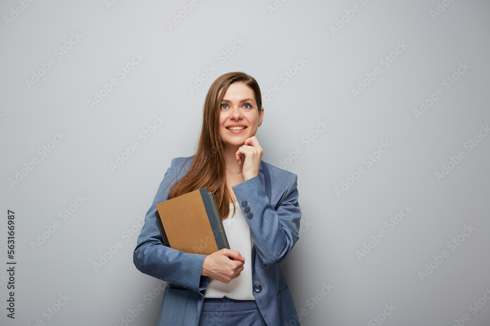 Thinking woman holding business paper, teacher or smiling student girl looking up isolated portrait..