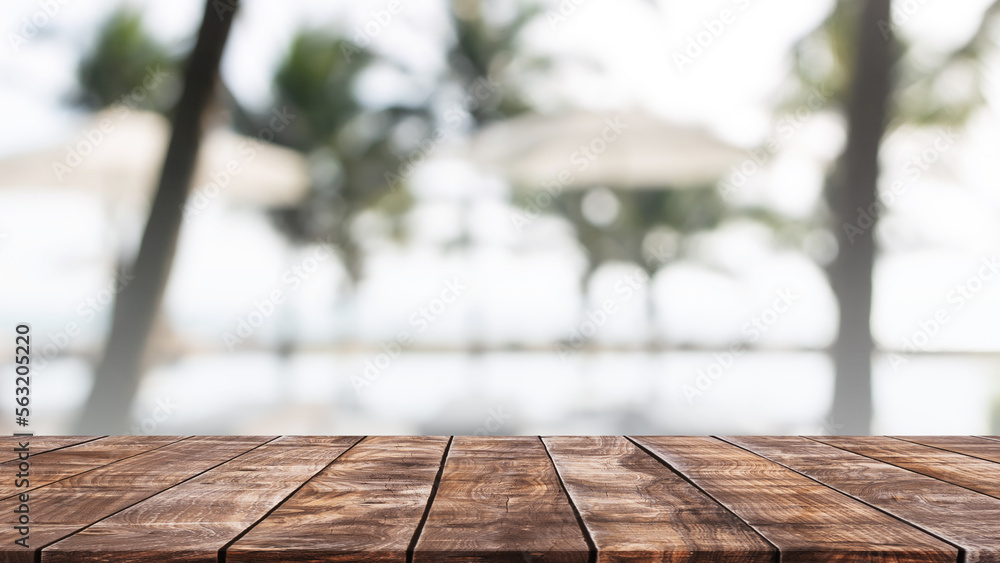 Empty wood table top and blurred summer beach bar in tropical resort banner background - can used for display or montage your products.